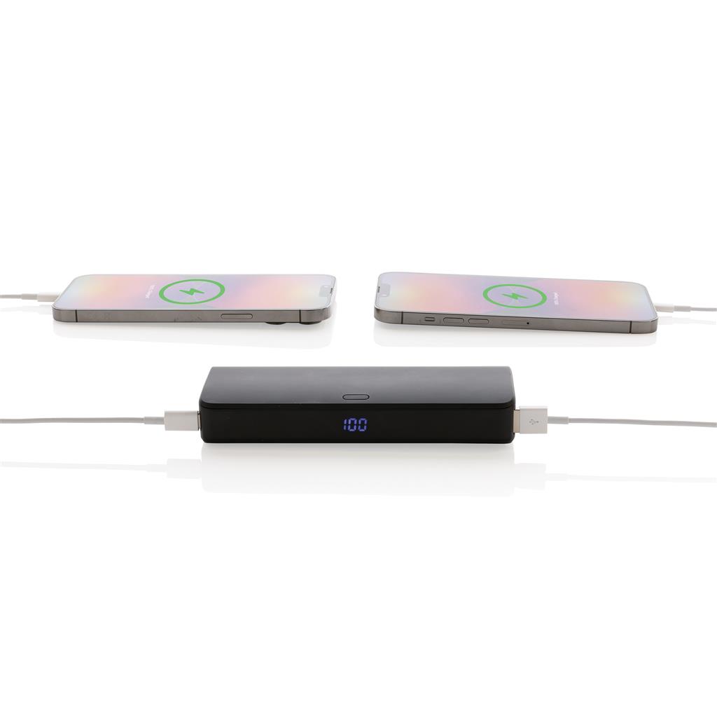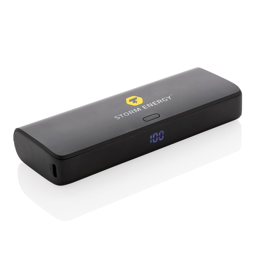 20.000 mAh 20W PD powerbank where the case is made out of RCS certified recycled ABS plastic. RCS (Recycled Claim Standard) is a standard to verify the recycled content of a product throughout the whole supply chain. Total recycled content: 20 % based on total item weight. With its sleek and space-saving design Flashcharge powerbank is remarkably compact, ensuring you can carry it effortlessly wherever you go.Experience lightning-fast charging for both iOS and Android devices. No more long waiting times; this powerbank ensures your devices reach full power in record time. The powerbank itself supports 18W fast re-charging so the powerbank can re-charged faster than a regular powerbank. Equipped with a Quick Charge 3.0 USB-A port and a 20W PD Type-C port, you can charge multiple devices simultaneously, without compromising on charging speed. Keep track of your power reserve with the integrated LED screen, ensuring you’re never caught with a depleted battery when you need it most.