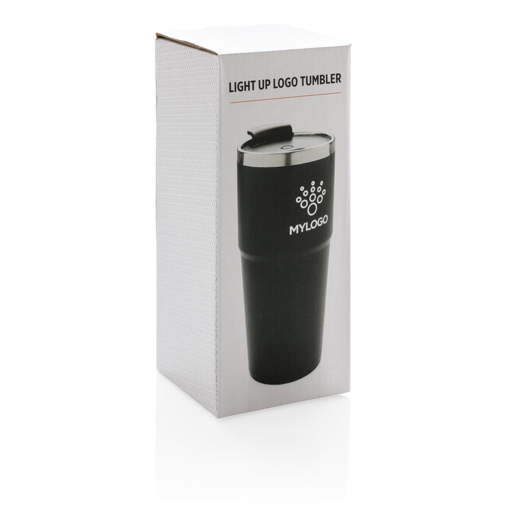 Double wall tumbler. 304 SS inside and ABS plastic outside. Engrave your logo and when picked up and shaken, the tumbler will light up your logo. Including 2 CR2032 cell battery Content: 480 ml.