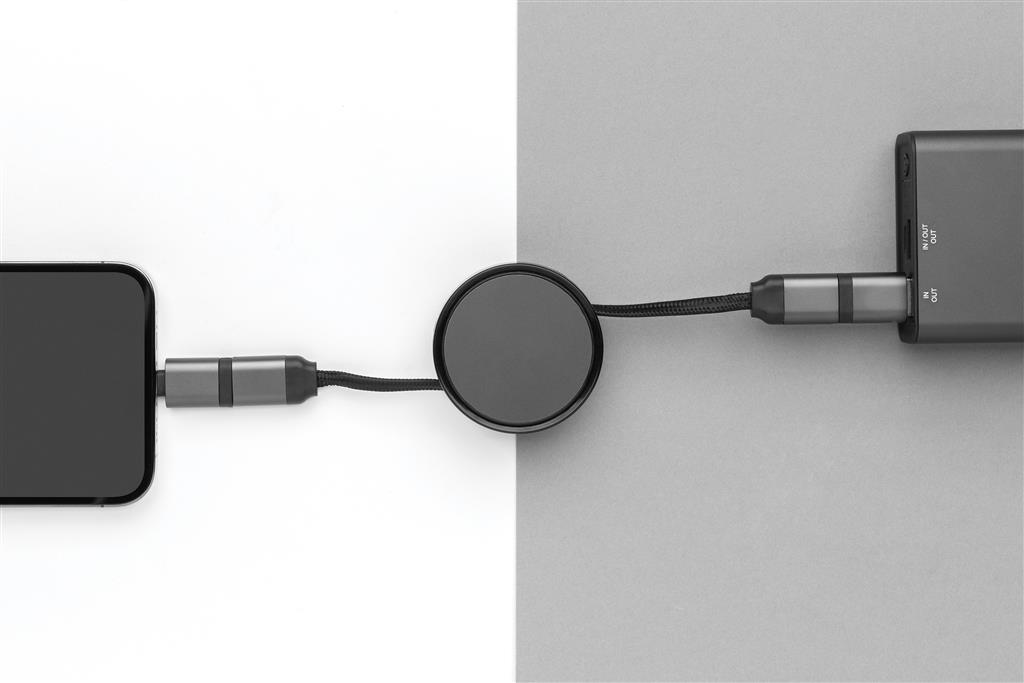 Retractable charging and data cable made with RCS (Recycled Claim Standard) certified recycled aluminum, recycled TPE and recycled pet. Total recycled content: 68% based on total item weight. RCS certification ensures a completely certified supply chain of the recycled materials. Aluminum does not lose its characteristics in the recycling process and can be recycled endlessly. With dual input connector: USB A and type-C. Triple output: Apple Lightning/Micro and Type C, offering in total 6 charging options. With RCS certified braided recycled PET cables with a length of 100 cm when completely extended. Packed in FSC® mix packaging. Suitable for charging, syncing, and compatible with car play ( type C to type C only). Supports fast charging up to 45W.