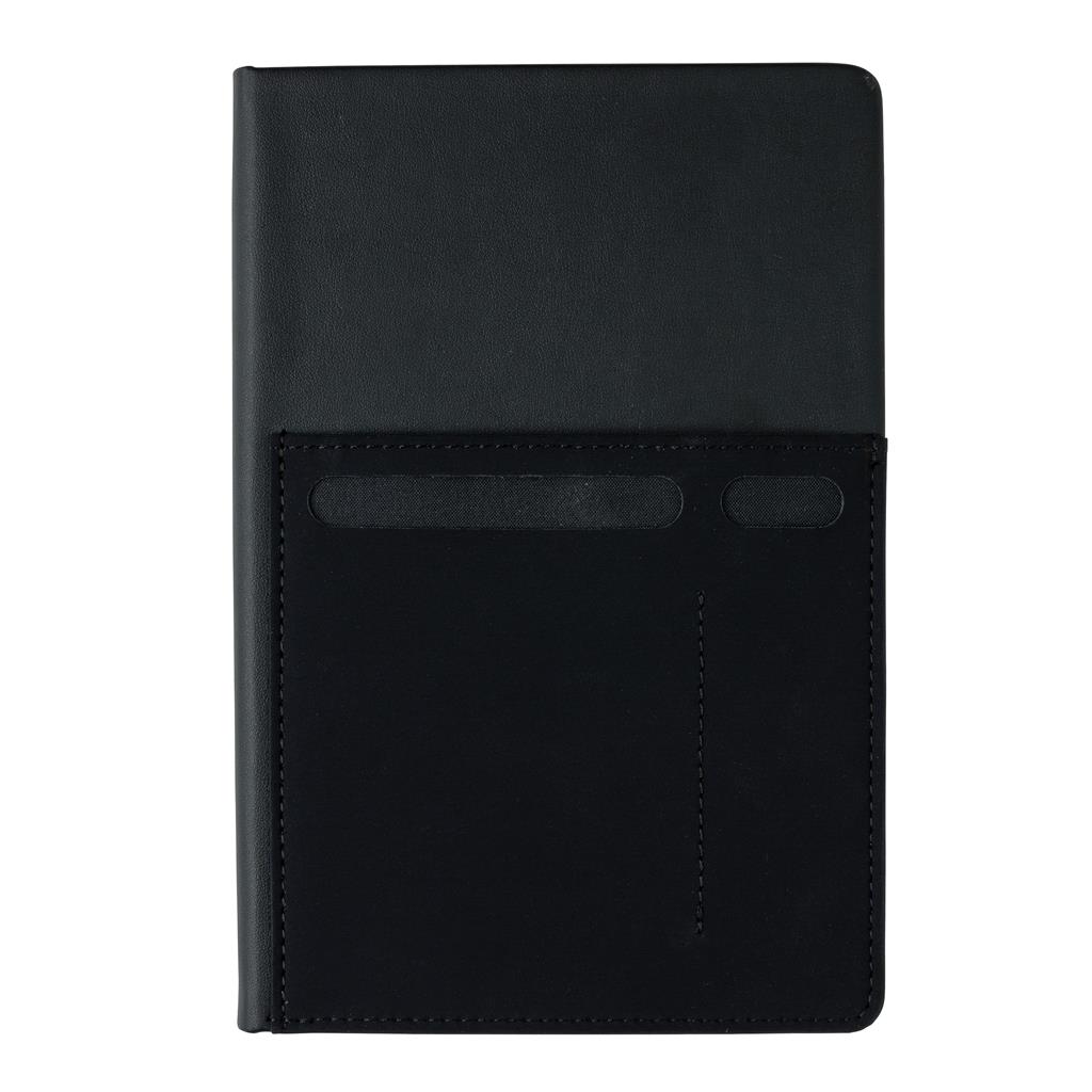 A5 notebook with 160 cream coloured lined pages of 80g/m2 inside. Front cover has a flexible phone pocket, pen pocket and larger sleeve pocket for documents. Phone pocket is 8cm wide which fits iPhone 7 plus.