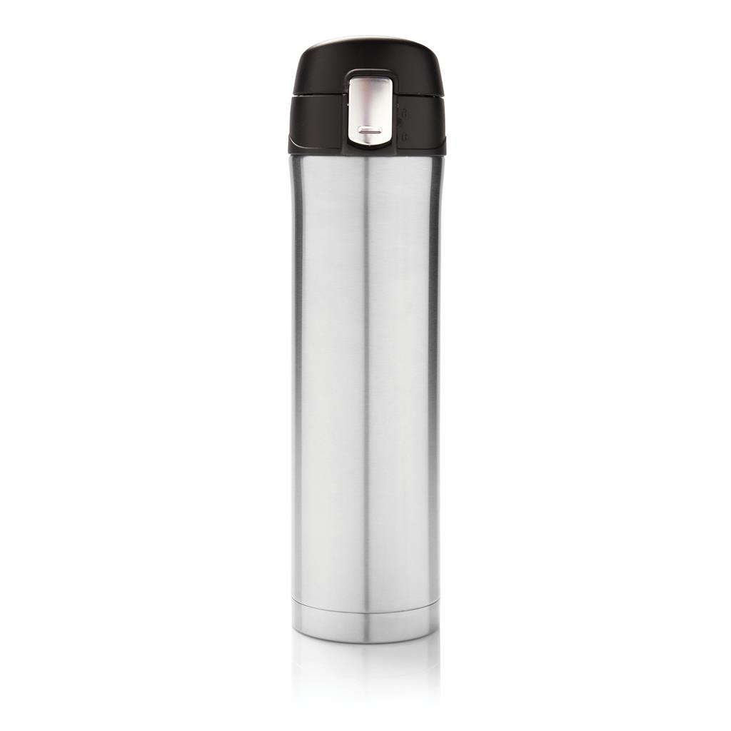 Double wall stainless steel vacuum flask that keeps your drink warm up to 5 hours or cool up to 15 hours. The lid is lockable and therefore avoids any risk of leaking or spilling. The lid is easy to keep clean for optimal hygiene and can even be washed in the dishwasher. The unique design of the flask allows you to drink conveniently and safely with one hand directly from the flask. The size of the flask is suitable to place in any car drink holder. Capacity: 450 ml.