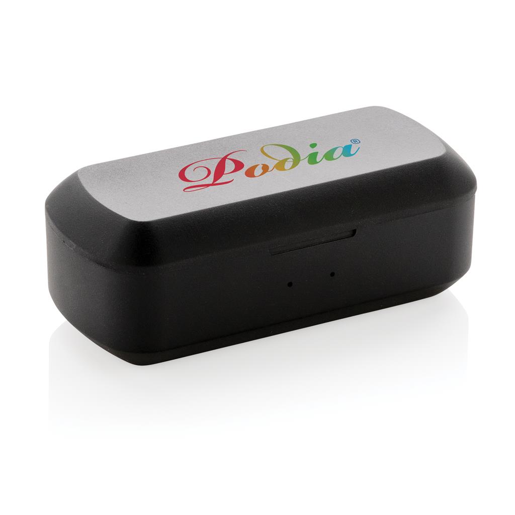 Let the music flow with these true wireless earbuds in charging case. The earbuds have a 35 mAh battery and can be re-charged in the 500 mAh charging case within 1 hour. With auto pairing function so easy to pair to your mobile device. Playing time on medium volume about 3 hours. With BT 5.0 for optimal connection. Operating distance up to 10 meters. With pick up and mic. Including 3 size silicon ear tips. ABS material casing.