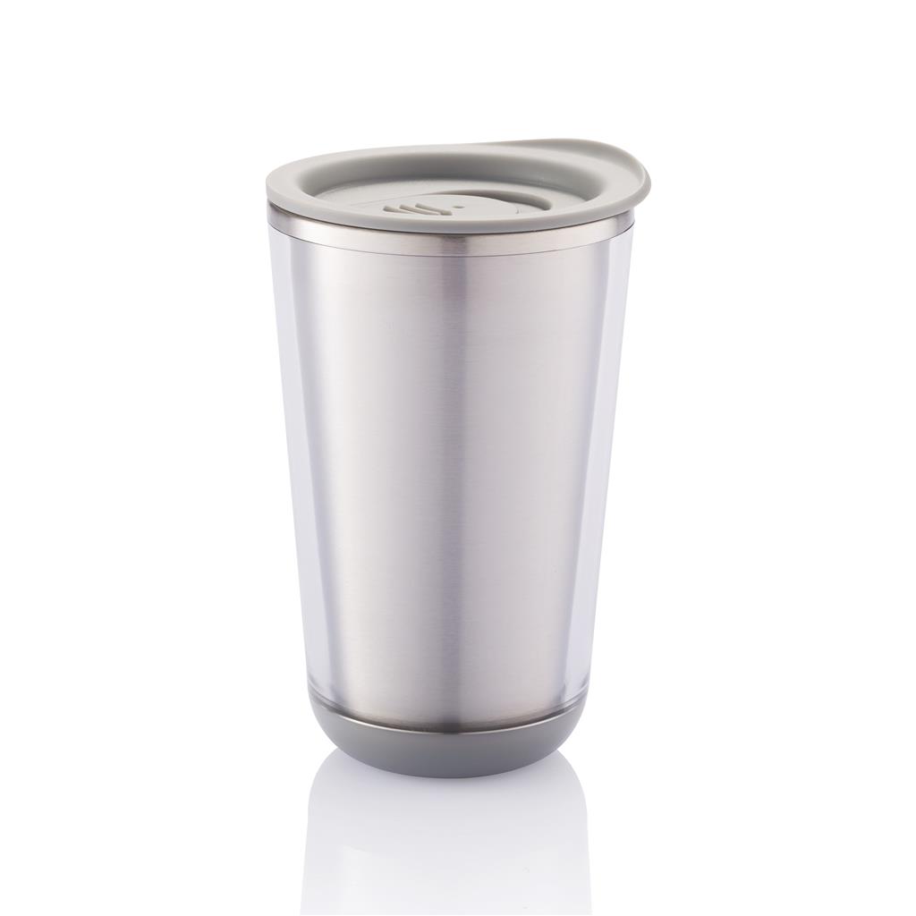 Fashionable stainless steel tumbler with geometric details. Inner body is made out of plastic. Handwash only. Content 300ml.
