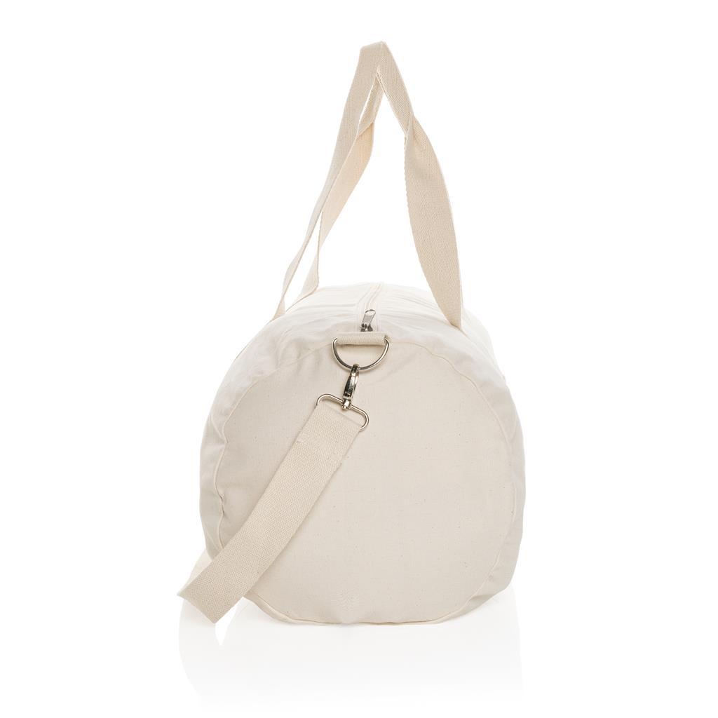 The Impact AWARE™ 285 gsm recycled canvas duffle bag undyed is the perfect way to carry your essentials for a short trip. This spacious duffle provides sufficient space for your essentials. The recycled canvas is undyed and used in its raw form, without chemicals from dyeing or bleaching. With AWARE™ tracer that validates the genuine use of recycled materials. Each duffle saves 2706 litres of water, the natural color even more: 3089 litre. 2% of proceeds of each Impact product sold will be donated to Water.org. Composition 70% recycled cotton, 30% recycled polyester.
