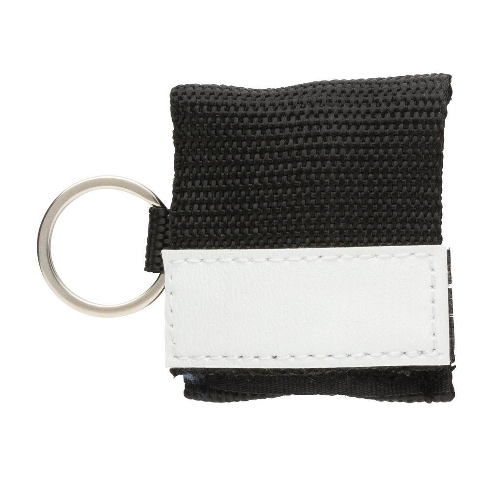 Small CPR face shield for mouth to mouth resuscitation in webbing style pouch with velcro closure and steel keyring. Conform EN 13485:2003. With non-return valve.