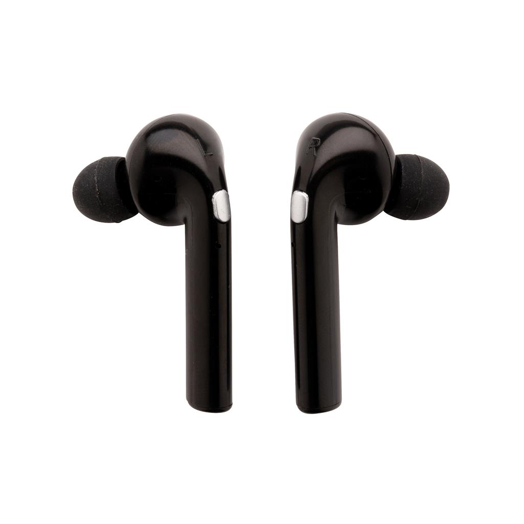 Ultimate freedom with these true wireless earbuds in charging case. The earbuds have a 35 mAh battery and can be re-charged in the 400 mAh charging case within 1 hour. Easy to pair with your mobile device to listen to your favorite music. Playing time on medium volume about 2 hours. With BT 5.0 for optimal connection. Operating distance up to 10 metres. with mic. Including 3 size eartips. ABS material.