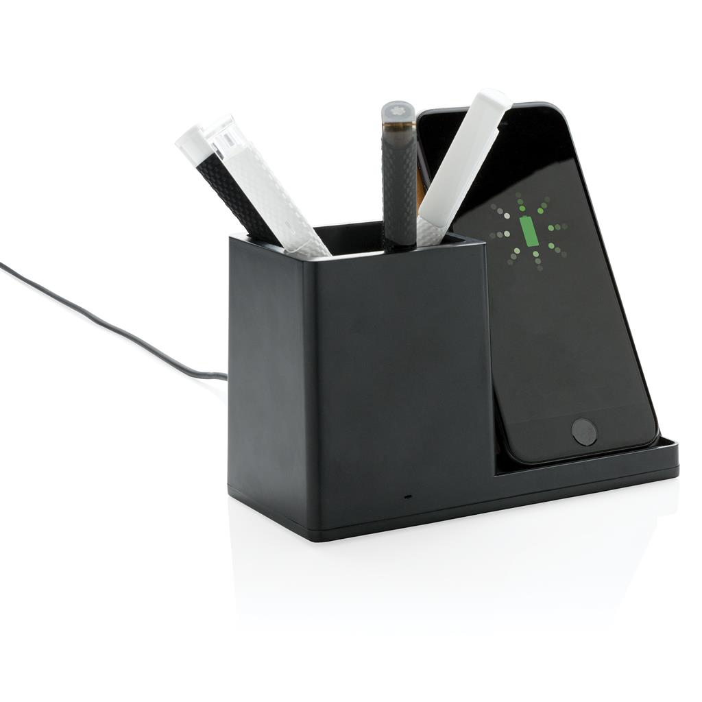 10W fast wireless charger with pen holder made with RCS (Recycled Claim Standard) certified recycled ABS. Total recycled content: 78% based on total item weight. RCS certification ensures a completely certified supply chain of the recycled materials. Bamboo wireless charging area made from FSC 100 bamboo. With two USB ports on the back to charge via cable. Wireless charging compatible with Android latest generations, iPhone 8 and up. Item and accessories PVC free. Including 120 cm type C charging cable made from RCS certified recycled TPE. Packed in FSC mix kraft box. Type-C Input 5V/2A; 9V/2A; Wireless output 5V/1A;9V/1.1A; (10W) Registered design®