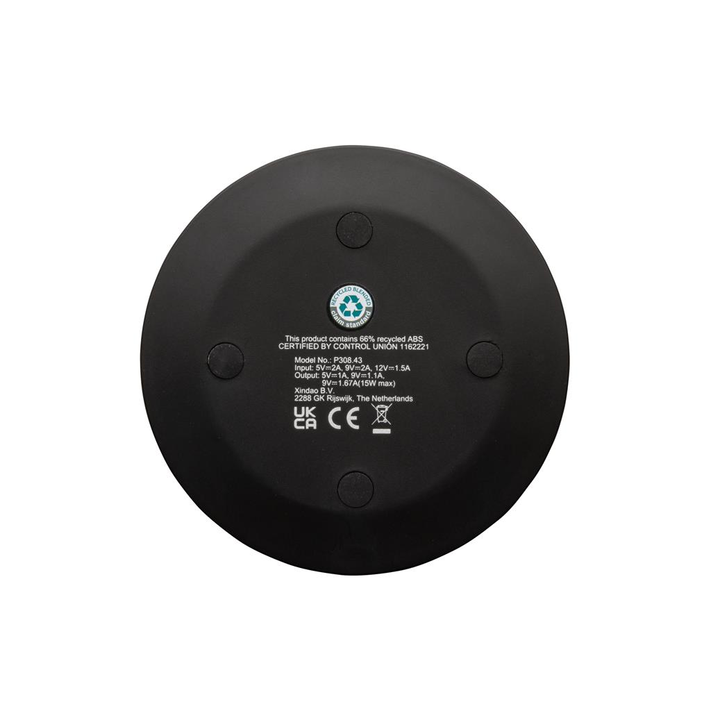 Ultra fast 15W wireless charger made with RCS (Recycled Claim Standard) certified recycled ABS. Total recycled content: 66% based on total item weight. RCS certification ensures a completely certified supply chain of the recycled materials. Wireless charging compatible with Android latest generations, iPhone 8 and up.Item and accessories PVC free. Including 120 cm type C charging cable made from RCS certified recycled TPE. Packed in FSC mix kraft box. Type-C in; Input 5V/2A; 9V/2A;12V/1.5A; Wireless output 5V/1A;9V/1.1A; 9V/1.67A(15W)