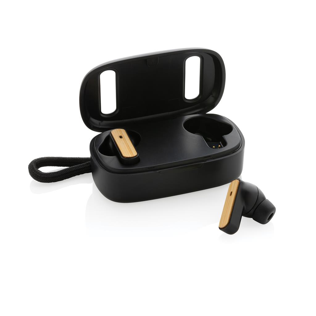 Next generation FSC® 100% Bamboo true wireless earbuds in RCS recycled ABS charging case. The earbuds and charging case are made with RCS (Recycled Claim Standard) certified recycled ABS. Total recycled content: 58% based on total item weight. RCS certification ensures a completely certified supply chain of the recycled materials. The perfectly fitting earbuds have a 40 mAh battery and can be re-charged in the 400 mAh charging case within 1 hour. With auto pairing function so easy to pair to your mobile device. Playing time on medium volume about 5 hours. With BT 5.3 for optimal connection. Operating distance up to 10 meters. With pick up and mic. Including 3 size silicone ear tips. Including GRS certified recycled TPE charging cable. Packed in FSC® mix kraft packaging. Item and accessories 100% PVC free.
