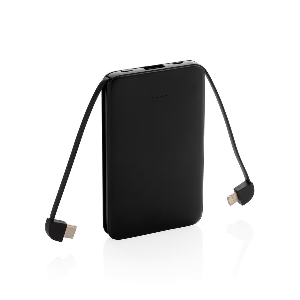 10.000 mAh pocket size powerbank where the case is made out of RCS certified recycled ABS plastic. RCS (Recycled Claim Standard) is a standard to verify the recycled content of a product throughout the whole supply chain. Total recycled content: 15% based on total item weight. When fully charged the powerbank provide you with enough energy to re-charge your mobile phone up to five times. The powerbank contains a long lasting grade A 10.000 mAh high-density lithium polymer battery. The power indicators will indicate the remaining energy level so you always know when to re-charge. Micro USB Input 5V/2A; Type-C Input 5V/2A; USB output 5V/2A; Item and accessories PVC free. Including PVC free recycled TPE material charging cable.