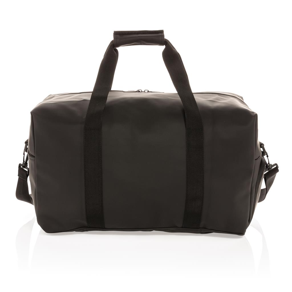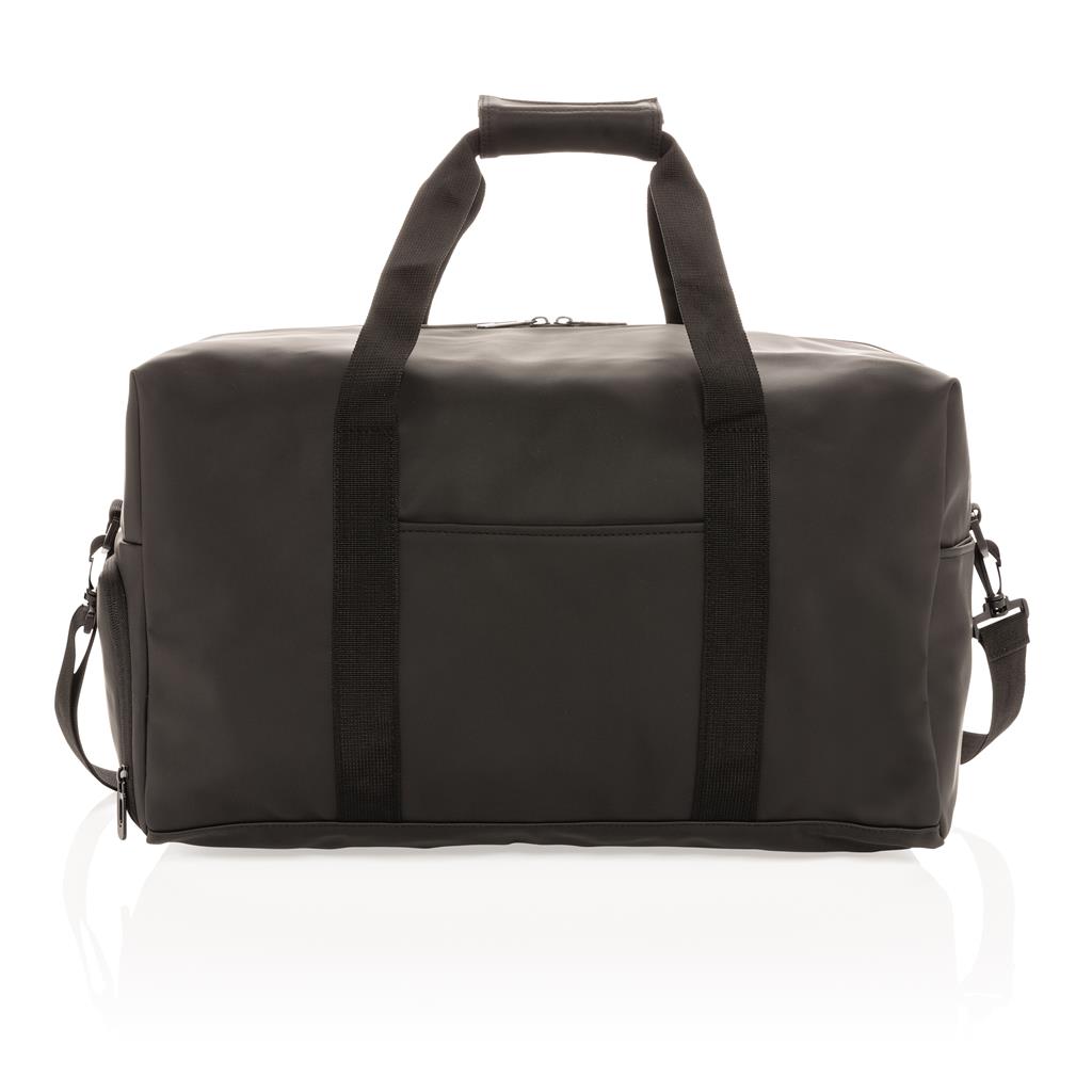 This weekend duffel made of smooth PU is suitable for daily trips to the gym as it is for a weekend getaway. It features a boxy minimalist design and has an external front pocket, inside pocket and a large main compartment. The bag has a convenient shoe compartment on the side. This bag can be worn over the shoulder or crosswise with the adjustable fabric carrying strap or carried by hand with the sturdy fabric handles. Exterior 100% PU. Interior 100% 210D polyester. PVC free.