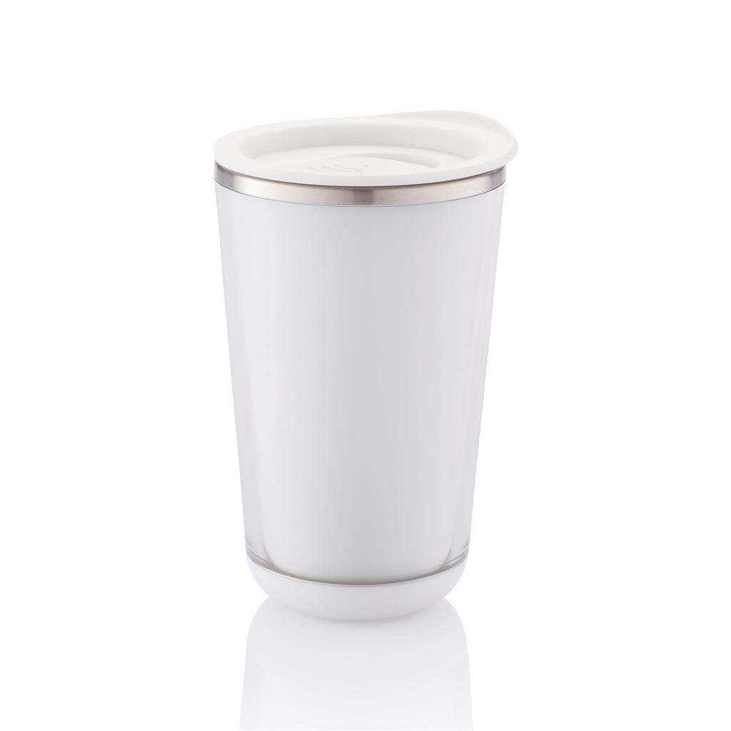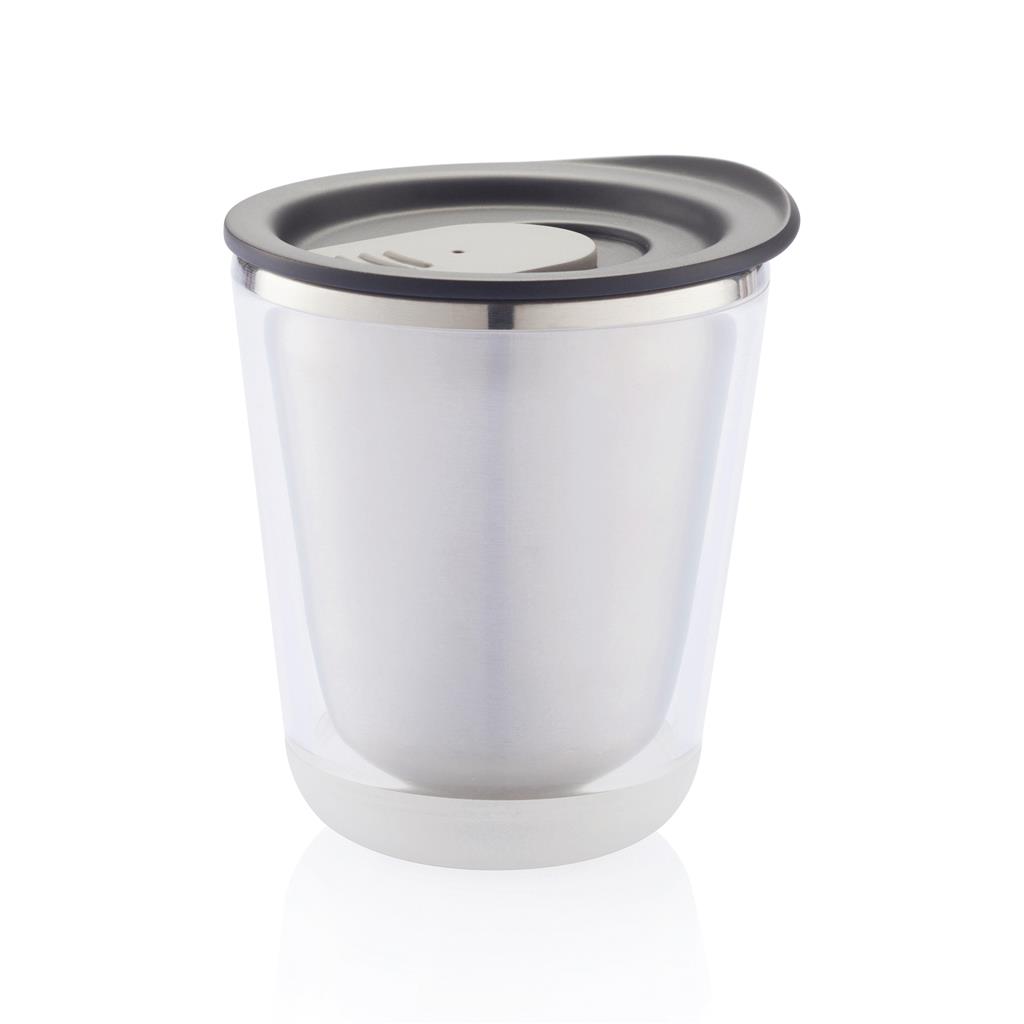 1L double wall and vacuum stainless steel flask with push closure and cup.