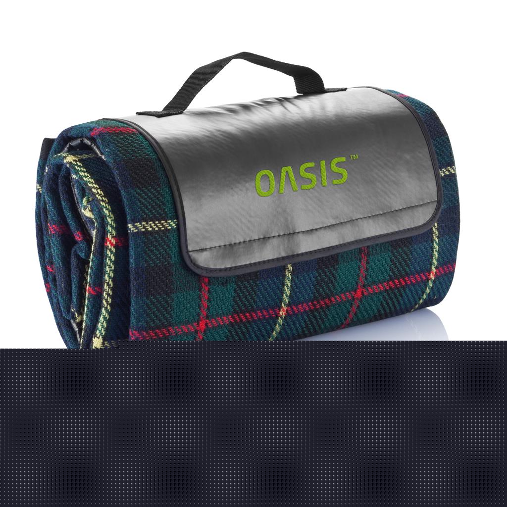 Traditional styled blanket, size 130x145cm, top woven acrylic 120gsm coloured square pattern, back of blanket is waterproof PVC 110gsm.