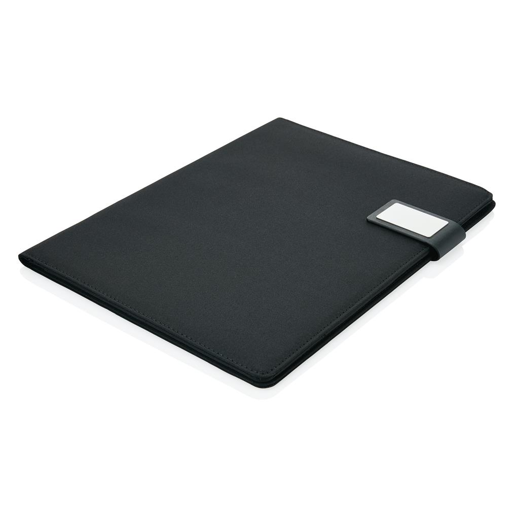 A4 tech portfolio with luxury magnetic metal closure. Inside: a tablet/phone stand, phone holder with see-through window which allows you to view and access your device. Suitable for most common phones for example iPhone 6 & Samsung S6. With sleeve for documents, 2 card holders and pen loop. Including recycled A4 notepad.
