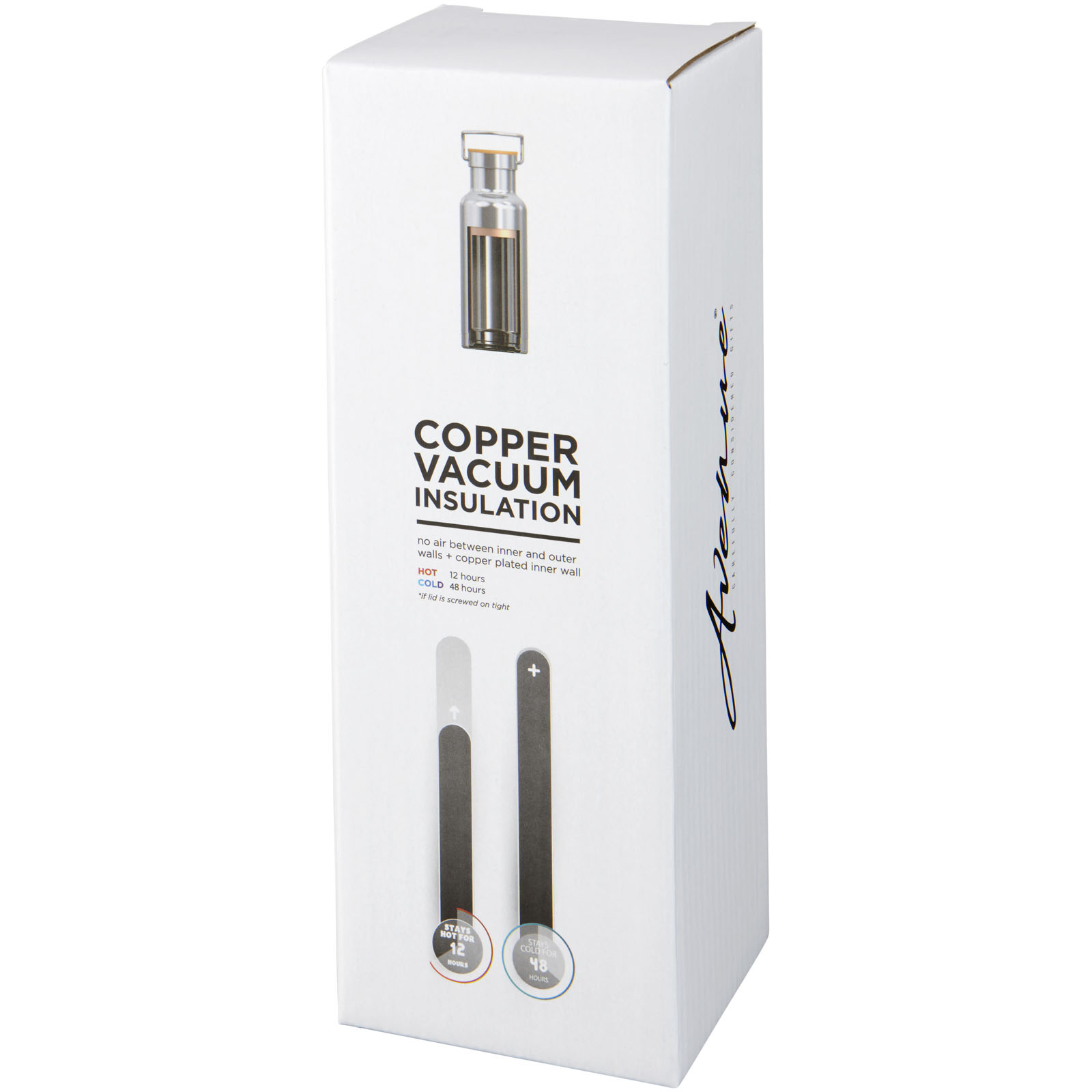 Double-walled stainless steel vacuum construction with copper insulation, which allows beverages to stay cold for 48 hours or hot for at least 12 hours. The construction also prevents condensation on the outside of the bottle. Screw-on lid with wood detail. On-trend, durable powder coating. Volume capacity is 480ml. Presented in an Avenue gift box.