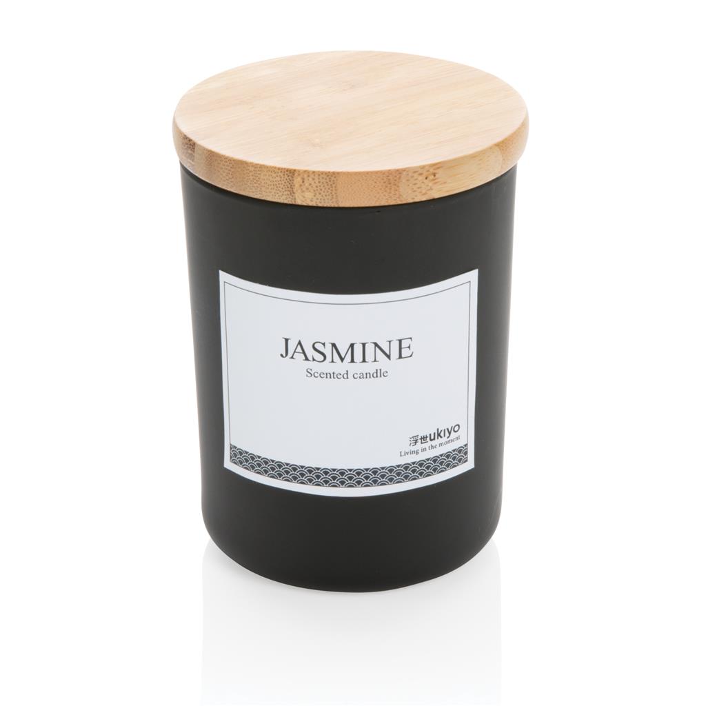 Create warmth and cosiness in your home with this Ukiyo scented candle. Enjoy the subtle jasmin scent that is released. The scented candle comes in an elegant jar with bamboo lid. 30 burning hours.