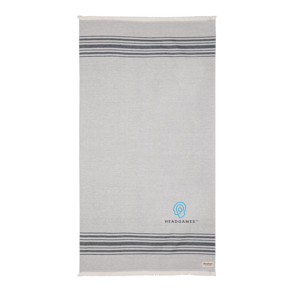 This lightweight, highly absorbent, sand-resistant, and quick dry towel is one of the best sustainable towels out there. Hammam towels are multifunctional: you can also use it as a picnic, baby blanket or as a yoga, beach, and gym towel. Even as a table cloth. Best of all, the thin material makes it ultra-portable and easy to toss in your beach bag, suitcase or over your shoulder. This towel containes 12% recycled cotton and is super soft and silky to the touch. With AWARE™ tracer that validates the genuine use of recycled cotton. Each towel saves 597,8 liters of water. 2% of proceeds of each Impact product sold will be donated to Water.org. Machine washable. Made in Portugal. OEKO-TEX® STANDARD 100. 2306129 Centexbel.