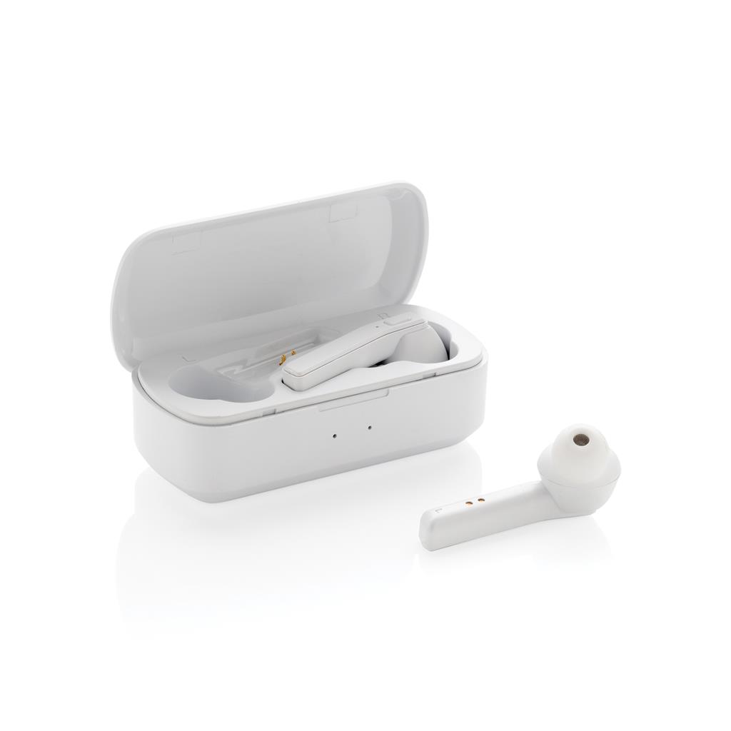 Ultimate freedom when listening to your music from your mobile device. These TWS earbuds come in a 300 mah wireless charging case with extra option to ad a logo that will light up when the case is being charged. The earbuds are re-charged in 1,5 hours and have a playing time up to 3 hours. BT 5.0 for auto pairing with your mobile device and pairing the earbuds together. Operating distance up to 10 meters. Including PVC free TPE micro usb cable to re-charge the charging case. With pick up function to answer calls. Including 3 size ear tips to fit all.